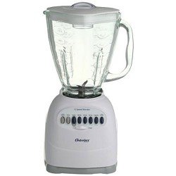 Offering 12 speeds and powered by a 450-watt motor, this blender stirs party dips, purées vegetables, creams butter, chops nuts, whips cream, mixes drinks, grates cheese, blends batters, shreds coconut, grinds coffee beans, liquefies soups, and crushes ice. For precise work there's a pulse button, and the "grate" button also functions as an "easy-clean" control for quickly cleansing the 40-ounce, scratch-resistant glass container with soap and water during multibatch work with the same food. (The container is also dishwasher-safe.) The blender's stainless-steel blade-assembly removes for cleaning. The container is calibrated in both ounces and liters, and its plastic lid contains a 2-ounce measuring insert. Fully assembled, the blender stands 13-3/4 inches high on a 7-inch-square base, which is clad in white plastic with a gray accent band and rubber feet. The blender carries a 1-year warranty against defects.